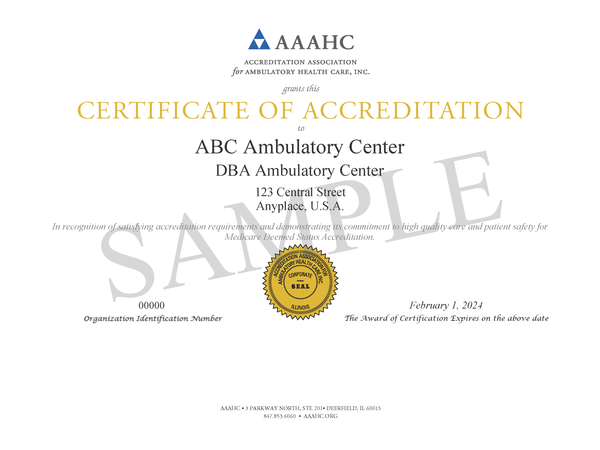 AAAHC provides one complimentary certificate of accreditation to each accredited organization upon successful completion of accreditation, as reflected in the organization's decision letter. Accredited organizations may order additional certificates. Please note this certificate is for organizations that have earned Medicare Deemed Status Accreditation only. Accredited organizations may order additional certificates for a fee. Please see eStore for details.